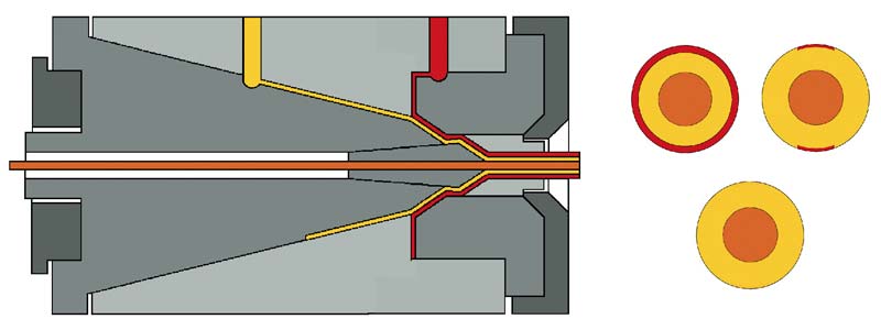 Co-extrusion insulation crossheads are designed for a main layer and an additional skin or stripe.